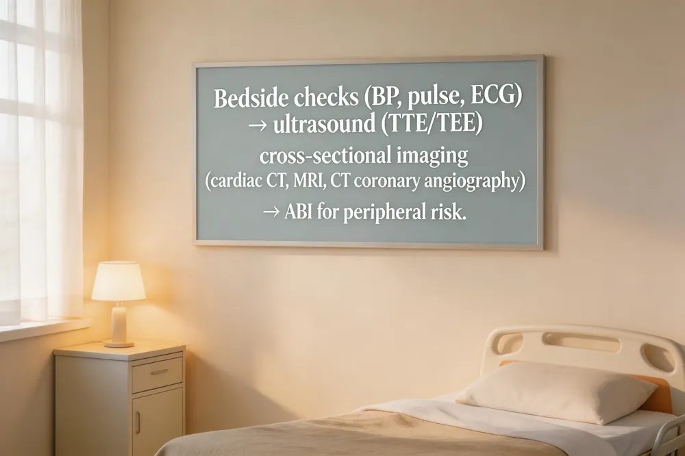 Types of heart tests – A heart‑health work‑up starts with bedside checks (blood‑pressure, pulse, and a quick ECG) that give an instant snapshot of rhythm and electrical activity. For deeper insight, ultrasound‑based studies such as a transthoracic echocardiogram (TTE) or a transesophageal echocardiogram (TEE) create real‑time movies of chambers, valves and wall motion. Cross‑sectional imaging – cardiac CT, cardiac MRI, and CT coronary angiography – visualizes the coronary arteries, plaque, and scar tissue without a surgical incision. Additional screens like a lipid panel, high‑sensitivity CRP, and ankle‑brachial index (ABI) round out risk assessment.