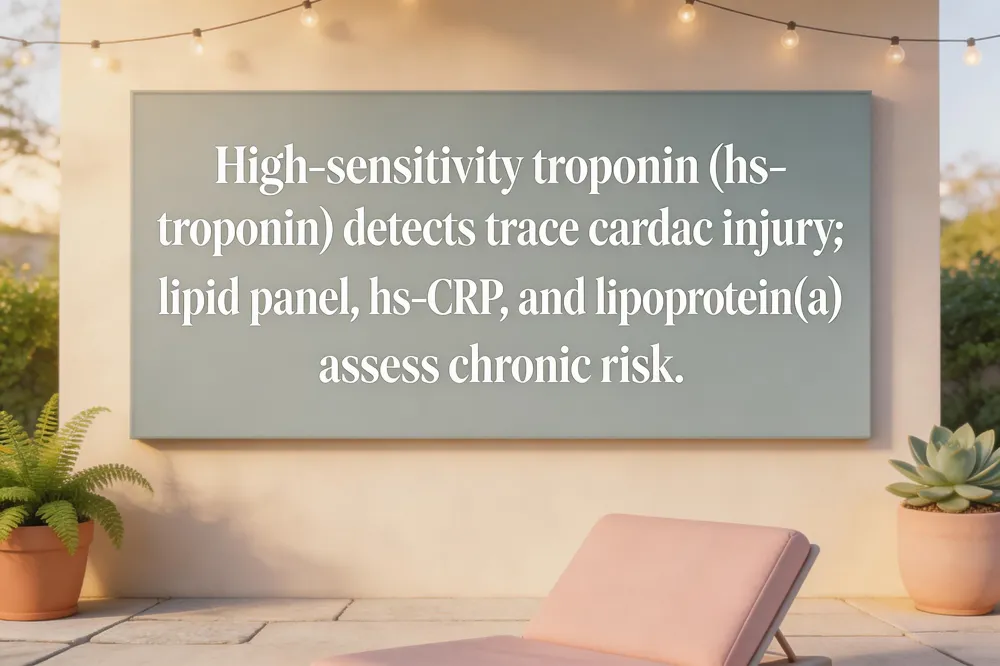 Beyond troponin, a comprehensive cardiovascular risk‑assessment blood panel often includes a lipid panel (total cholesterol, LDL‑C, HDL‑C, triglycerides), high‑sensitivity C‑reactive protein (hs‑CRP) to gauge inflammation, and lipoprotein(a) [Lp(a)] for genetic risk. Elevated LDL, low HDL, hs‑CRP > 2 mg/L, or high Lp(a) signal a greater chance of artery plaque buildup and future blockage. These markers, together with age, blood pressure, smoking status, diabetes, and family history, feed into calculators such as the ASCVD or Reynolds Risk Score to estimate a 10‑year event risk.