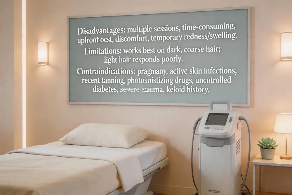 Laser hair removal usually requires 6‑8 sessions spaced 4‑6 weeks apart, making the process time‑consuming and more expensive than temporary methods such as shaving or waxing. Treatments can be uncomfortable, especially on sensitive areas, and often cause temporary redness, swelling, or mild skin irritation. The technology works best on dark, coarse hair; light‑colored hairs (blond, red, gray, white) respond poorly. While modern devices have cooling systems, rare but serious complications—burns, blisters, scarring, or pigment changes (hyper‑ or hypopigmentation)—can occur if settings are mismatched to a patient’s skin type. Ongoing maintenance touch‑ups may be needed, adding to long‑term cost.