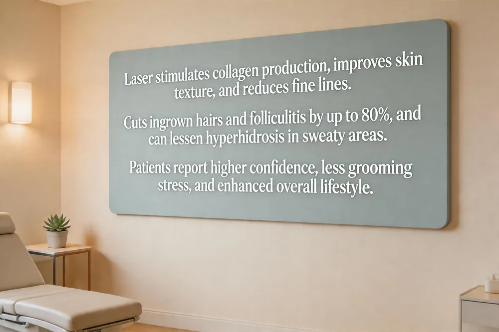 Modern laser hair removal does more than eliminate unwanted hair—it can boost overall skin health and well‑being. The focused light triggers selective photothermolysis, which not only damages hair follicles but also stimulates collagen production. This collagen remodeling smooths fine lines, improves texture, and gives the skin a firmer, more radiant appearance. Because the laser eliminates the follicle at its root, the incidence of ingrown hairs and folliculitis drops dramatically—studies show reductions of up to 80%, meaning fewer painful bumps, less inflammation, and a lower risk of secondary infection. In areas prone to excess sweating, such as the underarms or bikini line, fewer hairs reduce moisture retention, offering noticeable relief for hyperhidrosis and a drier, more comfortable skin surface. Beyond the physical benefits, patients frequently report heightened confidence and a psychological uplift. The freedom from daily shaving, waxing, or plucking removes a constant grooming stress, allowing individuals to enjoy social activities, athletic performance, and personal intimacy without self‑consciousness. Together, these skin‑level improvements and confidence boost make laser hair removal a holistic lifestyle enhancer.
