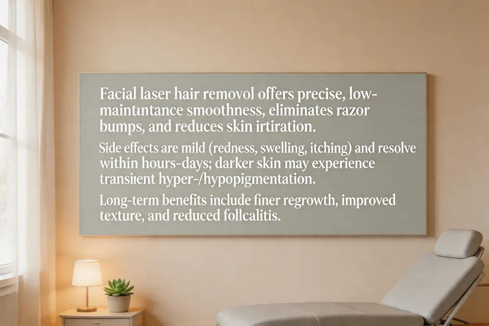 Laser hair removal on the face is a precise, low‑maintenance solution that offers lasting smoothness without the daily hassle of shaving or waxing. The treatment targets dark, coarse hairs while sparing surrounding skin, which virtually eliminates razor bumps and ingrown hairs and reduces skin irritation. Sessions are quick—often under a minute for areas such as the upper lip—making them fit easily into a busy lifestyle.