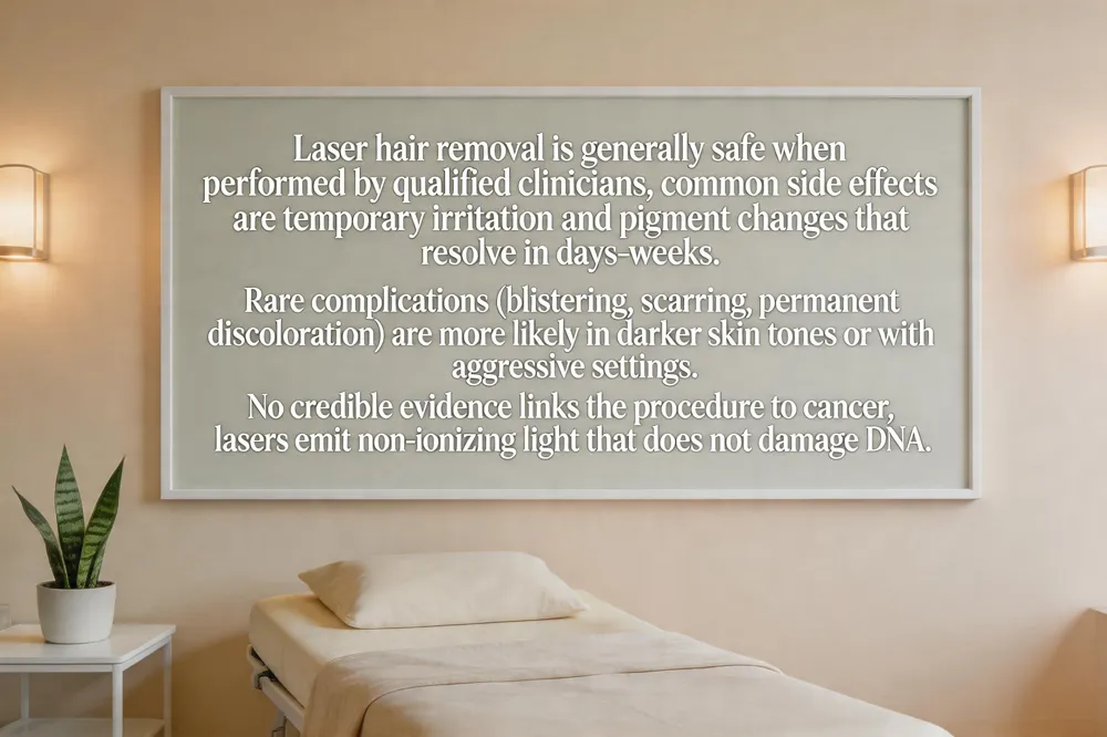 Laser hair removal is generally safe when performed by a qualified medical professional. The most common side effects are temporary skin irritation, redness, and mild pigment changes that resolve within days to weeks. Rare complications such as blistering, scarring, or permanent discoloration can occur, especially in darker skin tones or when aggressive settings are used. Long‑term side effects are uncommon; the main lasting concerns are pigment alterations (hyper‑ or hypopigmentation) and, rarely, scarring or texture changes. Paradoxical hair growth or occasional graying has been reported but is very rare. No credible evidence links laser hair removal to cancer. The lasers (Alexandrite, diode, Nd:YAG) emit non‑ionizing light that does not damage DNA. Over decades of use, large studies have found no statistically significant increase in skin cancer risk. Patients with a personal or family history of skin cancer should discuss precautions, but when performed by trained clinicians using FDA‑approved devices, the procedure remains a low‑risk, safe cosmetic option.