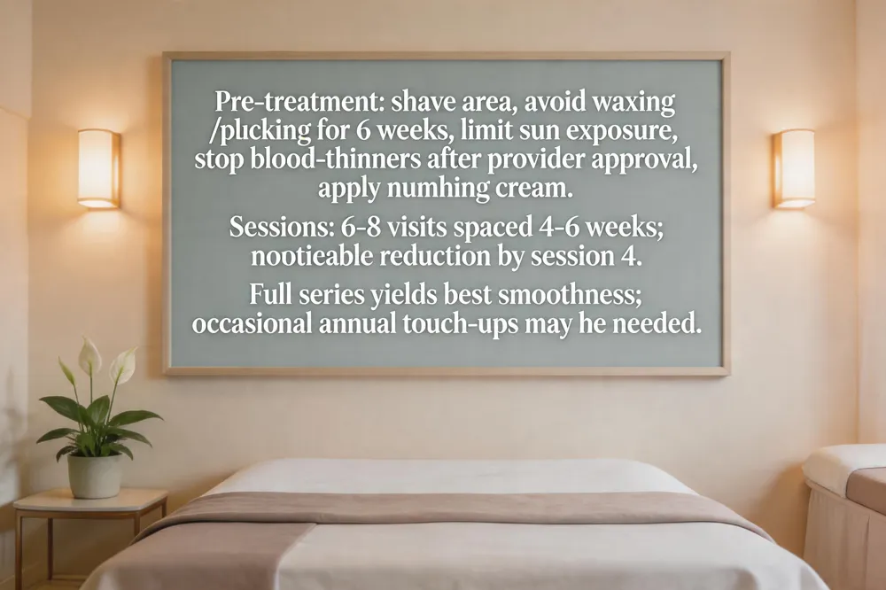 Before your first laser session, shave the area to be treated and Patients must avoid plucking, waxing, or electrolysis for six weeks before treatment. Limit sun exposure and tanning for the same period, and discontinue blood‑thinning medications (e.g., aspirin) after consulting your provider. On the day of treatment, a topical numbing cream is often applied 20‑30 minutes before the laser, and both you and the technician will wear protective eye gear.