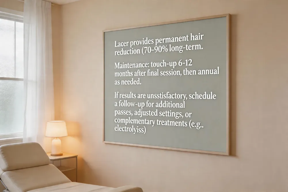 If results are unsatisfactory: Begin by scheduling a follow‑up consultation with your provider. The clinician will assess the treated area, review your treatment records, and may suggest additional laser passes with adjusted settings, complementary procedures (microneedling, chemical peels), or targeted electro‑lysis for stubborn hairs. Short‑term topical regimens or laser‑assisted skin rejuvenation can address discoloration or texture changes. If expectations still aren’t met, consider alternative hair‑removal methods while allowing the skin to fully heal. Maintaining realistic expectations and adhering to after‑care instructions are essential for the best possible outcome.
