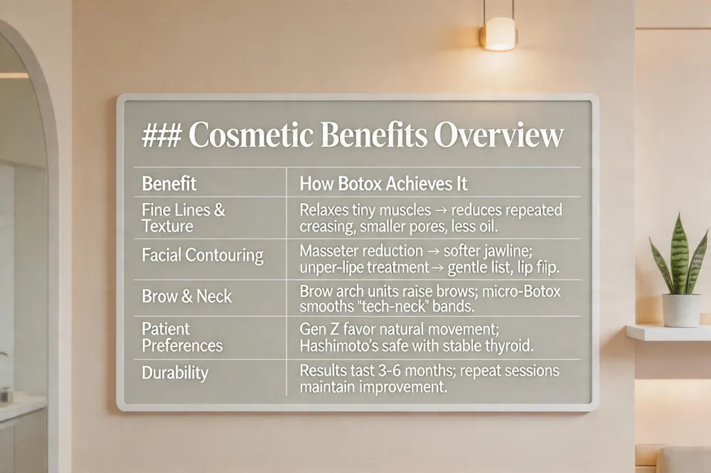 Gen Z patients often prefer natural movement and may shy away from overt Botox, opting for preventive skincare and minimally invasive techniques that preserve expression. For those with autoimmune conditions such as Hashimoto’s disease, Botox remains safe when thyroid levels are stable and a qualified clinician tailors the dose and injection sites. Overall, Botox offers a versatile, low‑downtime option that enhances skin texture, facial symmetry, and confidence while fitting into a personalized, wellness‑focused aesthetic plan.