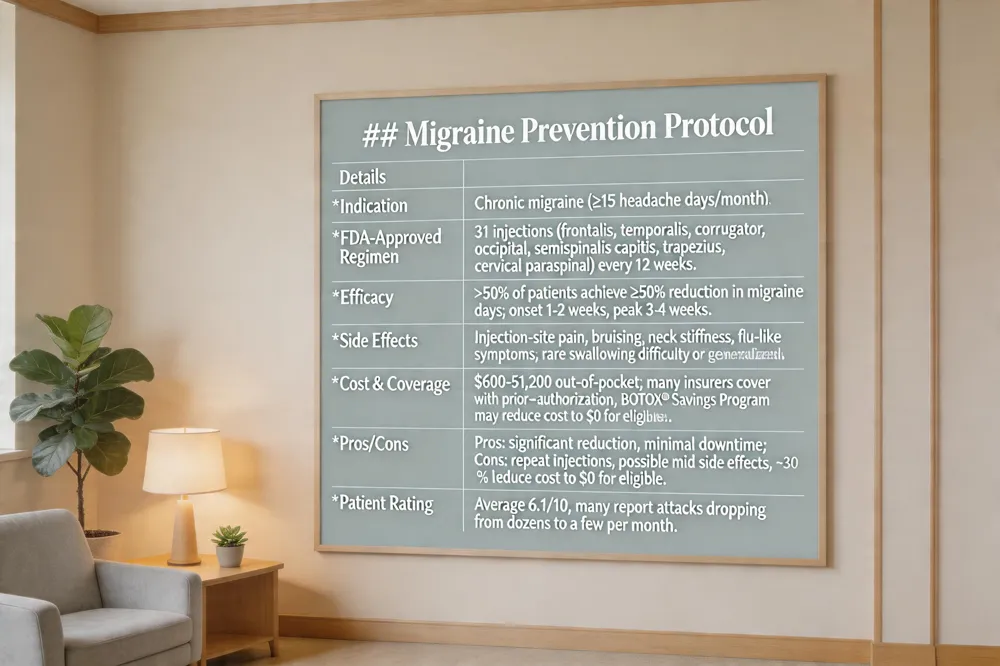 Details | |---|---| | Indication | Chronic migraine (≥15 headache days/month). | | FDA‑Approved Regimen | 31 injections (frontalis, temporalis, corrugator, occipital, semispinalis capitis, trapezius, cervical paraspinal) every 12 weeks. | | Efficacy | >50 % of patients achieve ≥50 % reduction in migraine days; onset 1‑2 weeks, peak 3‑4 weeks. | | Side Effects | Injection‑site pain, bruising, neck stiffness, flu‑like symptoms; rare swallowing difficulty or generalized weakness. | | Cost & Coverage | $600‑$1,200 out‑of‑pocket; many insurers cover with prior‑authorization; BOTOX® Savings Program may reduce cost to $0 for eligible. | | Pros/Cons | Pros: significant reduction, minimal downtime; Cons: repeat injections, possible mild side effects, ~30 % limited benefit. | | Patient Rating | Average 6.1/10; many report attacks dropping from dozens to a few per month. |