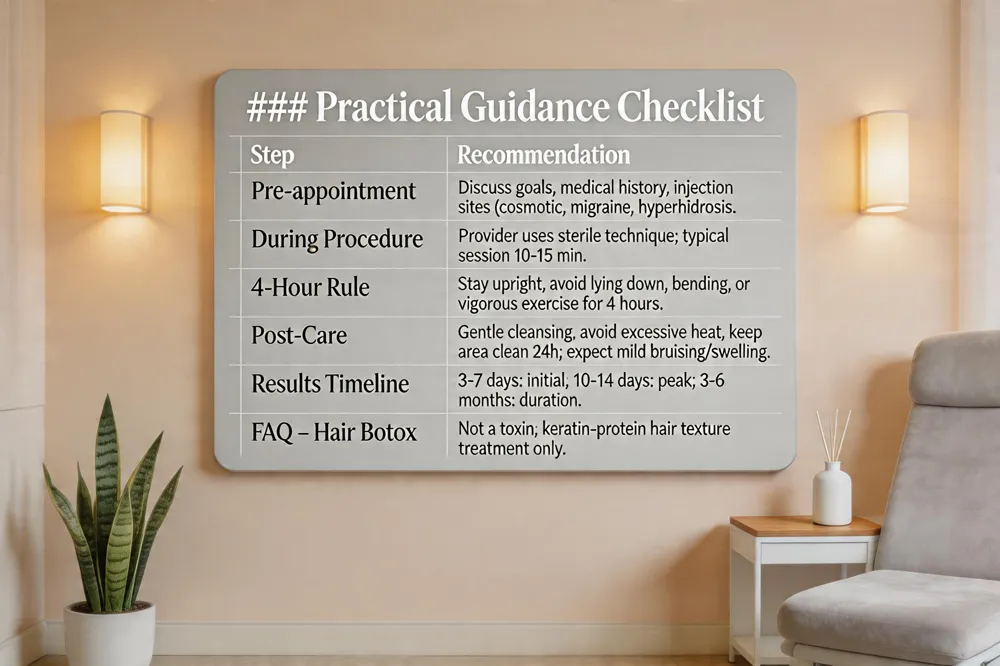 | Pre‑appointment | Discuss goals, medical history, and injection sites (cosmetic, migraine, hyperhidrosis). |