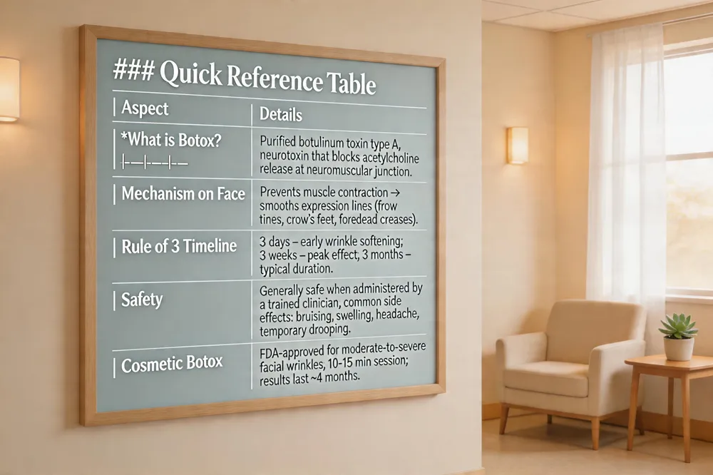 | Cosmetic Botox | FDA‑approved for moderate‑to‑severe facial wrinkles; 10‑15 min session; results last ~4 months. |