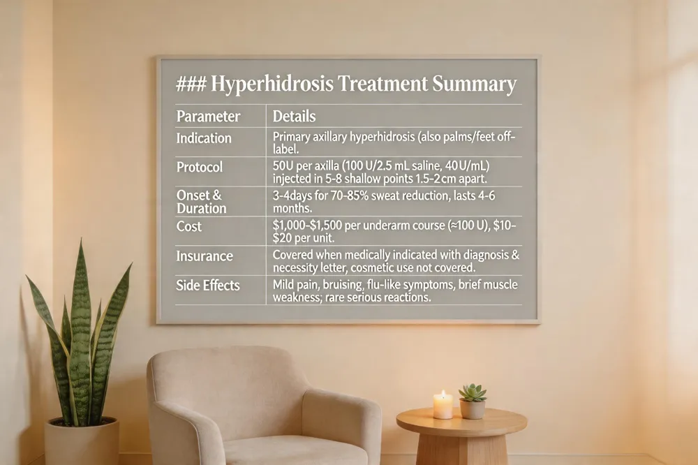 Insurance – Most U.S. plans cover therapeutic Botox for primary axillary hyperhidrosis when a physician supplies a diagnosis and a medical‑necessity letter. Cosmetic‑only uses are not covered. If denied, an appeal with additional clinical evidence often succeeds.