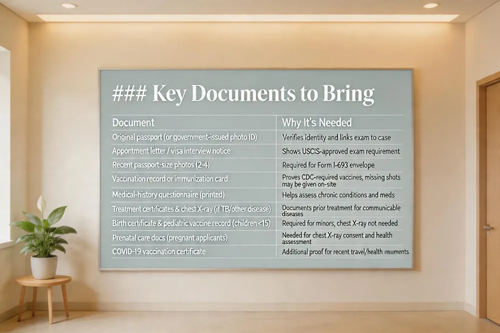 When you walk into a civil surgeon’s office for your immigration medical exam, the first thing the clinician will check is a valid government‑issued photo ID—usually a passport or driver’s license—and the exact immigration paperwork listed on your appointment letter (e.g., the visa interview notice or I‑485 receipt). Bring the original passport, a copy of the appointment letter, and a recent passport‑size photo; these items confirm your identity and link the exam to your case.