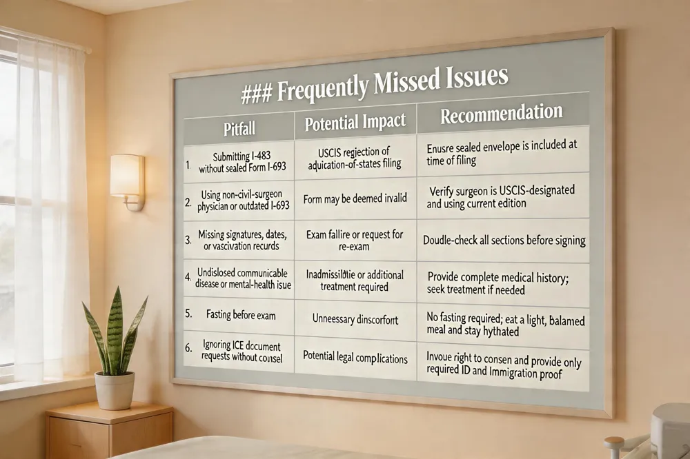 | Using non‑civil‑surgeon physician or outdated I‑693 edition | Form may be deemed invalid | Verify surgeon is USCIS‑designated and using current edition |