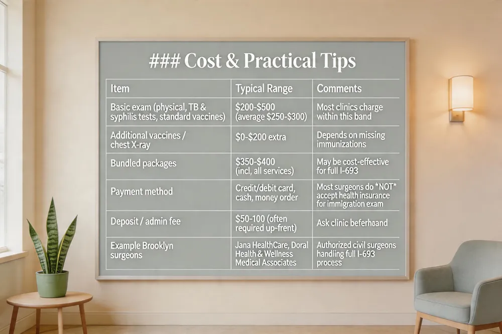 FAQs – “Immigration medical exam near me?” Use the USCIS tool or search “USCIS civil surgeon Brooklyn.” “USCIS medical exam cost?” Expect $200‑$500, with $250‑$300 common for the exam itself. “How much do doctors charge for I‑693?” Typical total $250‑$650, including a $50‑$100 administrative fee. “Immigration medical exam doctor list?” The USCIS “Find a Doctor” page gives a complete local list.