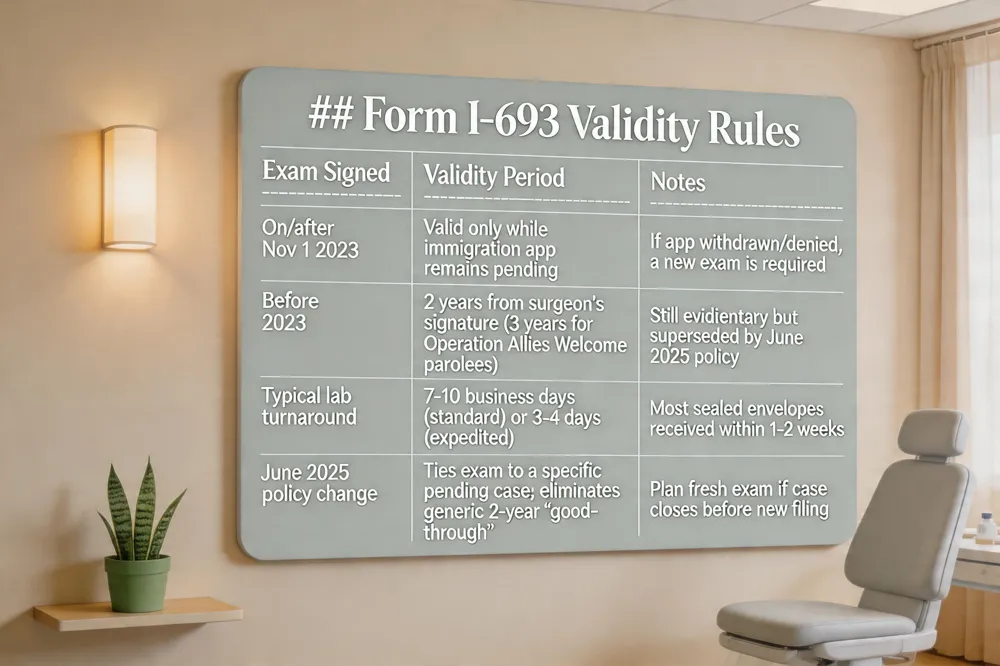 A Form I‑693 signed on or after Nov 1 2023 is valid only while the immigration application it accompanies remains pending. If that application is withdrawn, denied, or otherwise closed, a new exam is required. Exams signed before Nov 1 2023 retain evidentiary value for two years from the civil surgeon’s signature (three years for certain parolee cases such as Operation Allies Welcome). The earlier “indefinite” validity announced in April 2024 was superseded by the June 2025 policy that ties the exam to a specific case.