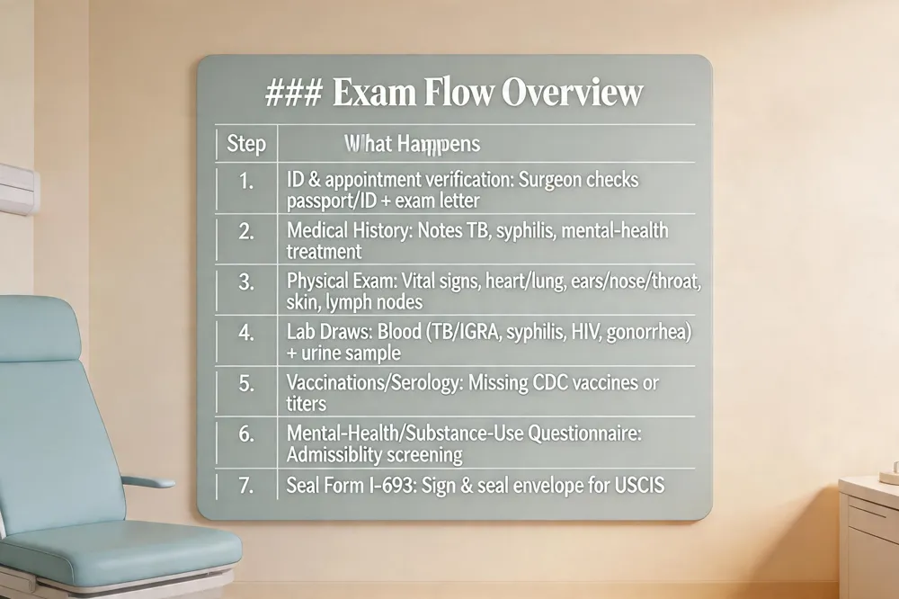 When you arrive, a USCIS‑approved civil surgeon (or a panel physician abroad) will first verify your passport (or other photo ID) and the appointment letter. The doctor then reviews your medical and immunization history, noting any prior tuberculosis, syphilis, or mental‑health treatment. A comprehensive physical follows: vital signs, heart and lung auscultation, inspection of eyes, ears, nose, throat, skin, and lymph nodes. Blood is drawn and a urine sample is collected for laboratory testing that screens for tuberculosis (IGRA or chest X‑ray if indicated), syphilis, HIV, and gonorrhea. Any missing vaccines from the CDC‑required list (MMR, Tdap, varicella, hepatitis A/B, influenza, etc.) are administered on‑site or documented with a blood‑titer result. The clinician also conducts a brief mental‑health and substance‑use questionnaire to identify disorders that could affect admissibility. After all required tests are completed and any follow‑up referrals are made, the surgeon signs and seals Form I‑693, which you will submit with your green‑card application.
