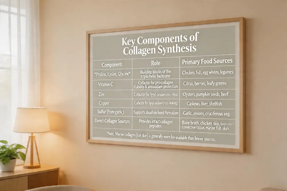 - A collagen‑supporting diet supplies the amino acids (proline, lysine, glycine) from protein‑rich foods (chicken, fish, egg whites, beans, nuts) and the essential cofactors vitamin C, zinc, copper and sulfur from citrus, bell peppers, leafy greens, garlic and cashews. Limiting sugar and refined carbs reduces glycation, protecting existing collagen.