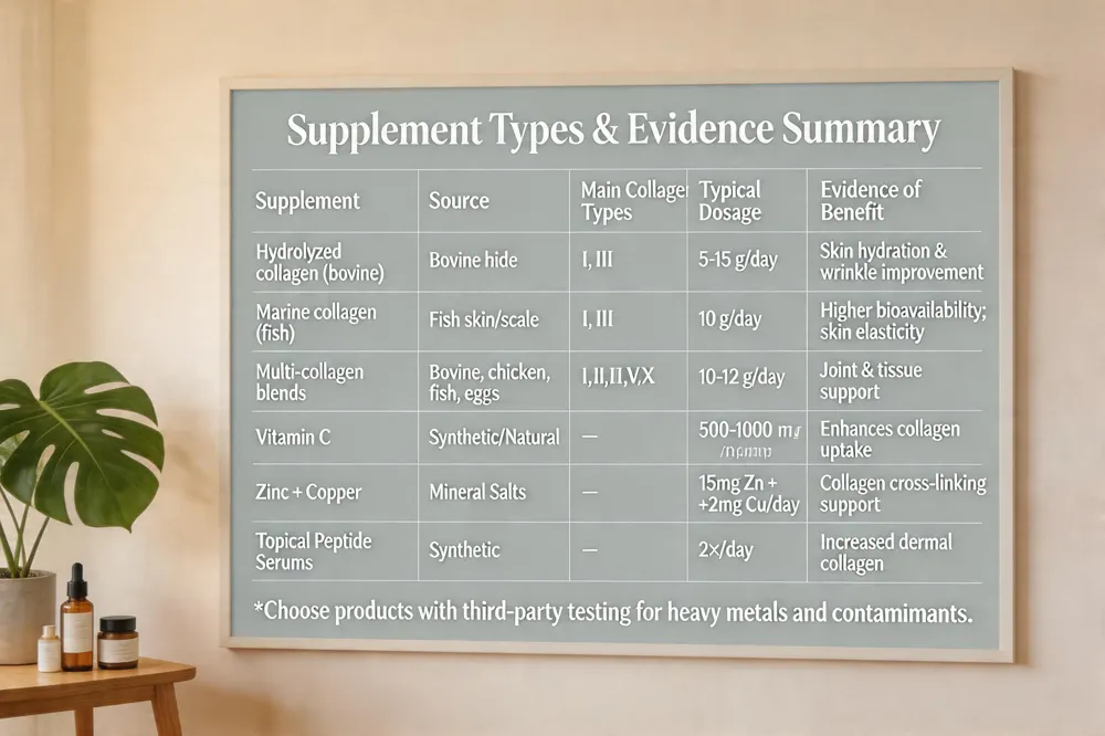 | Supplement | Source | Main Collagen Types | Typical Dosage | Evidence of Benefit |