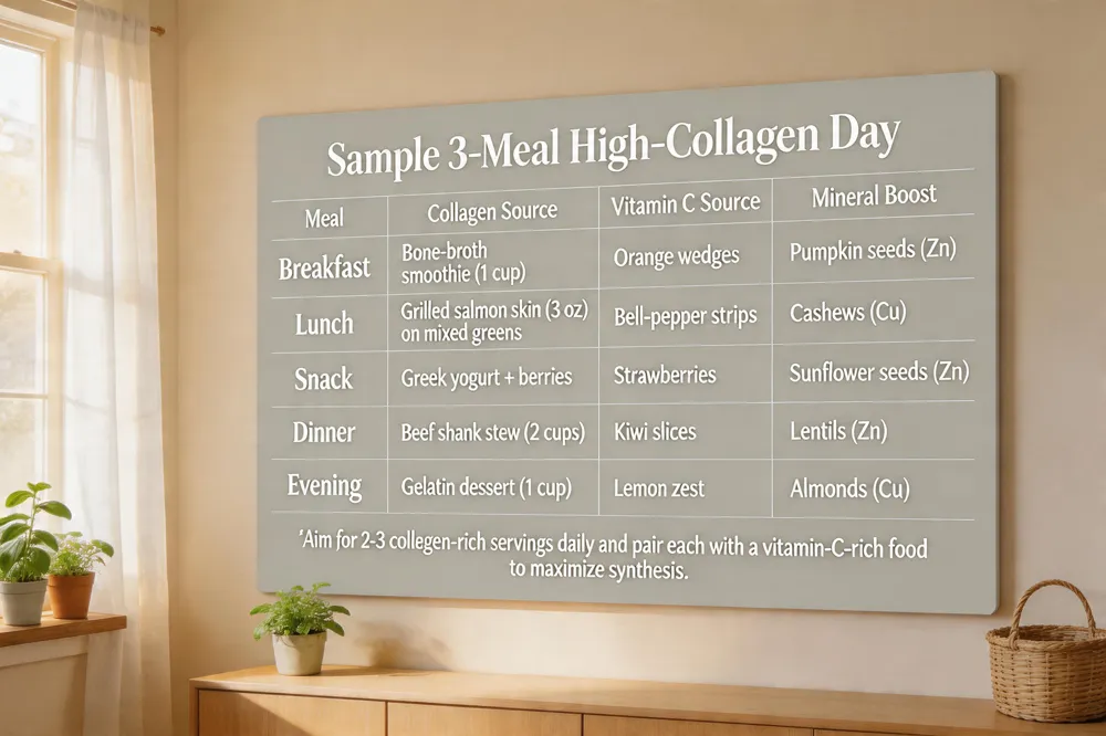 Aim for 2‑3 collagen‑rich servings daily and pair each with a vitamin‑C‑rich food to maximize synthesis.