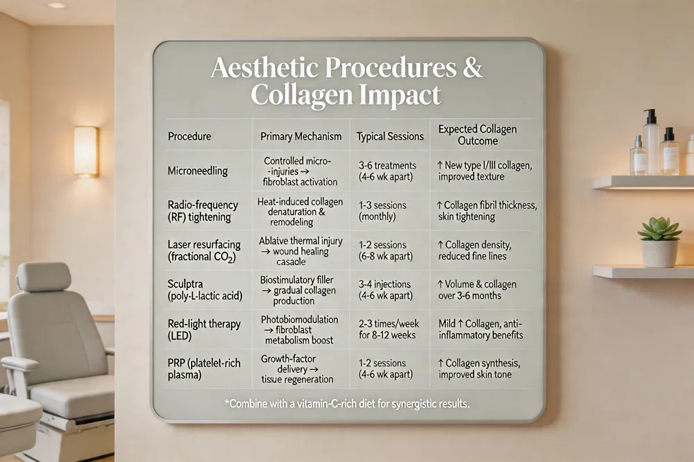 | Microneedling | Controlled micro‑injuries → fibroblast activation | 3‑6 treatments (4‑6 wk apart) | ↑ New type I/III collagen, improved texture |