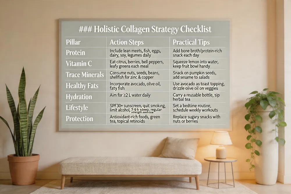 Strong, elastic skin rests on three nutrient pillars: protein‑rich foods that supply glycine, proline and lysine; vitamin C‑rich fruits and vegetables that act as a co‑factor for pro‑collagen conversion; and trace minerals such as zinc and copper that enable cross‑linking of collagen fibers. Include poultry, fish, eggs, dairy, soy and legumes for amino acids, citrus, berries, bell peppers and leafy greens for vitamin C, and nuts, seeds, beans and cashews for zinc and copper. Lifestyle habits that preserve elasticity are equally vital: use SPF, quit smoking, limit alcohol, get 7‑9 hours of sleep and stay active to reduce inflammation. Practical tips include adding lemon to water, swapping sugary snacks for almonds, drinking bone‑broth or a spinach‑avocado smoothie, and using a hyaluronic‑acid moisturizer. Avoid common pitfalls such as excessive refined‑carb intake, chronic dehydration and over‑exposure to UV light, all of which accelerate collagen glycation and breakdown. By combining these dietary choices with protective habits, you naturally boost collagen production, improve skin elasticity, and support lasting firmness from home.