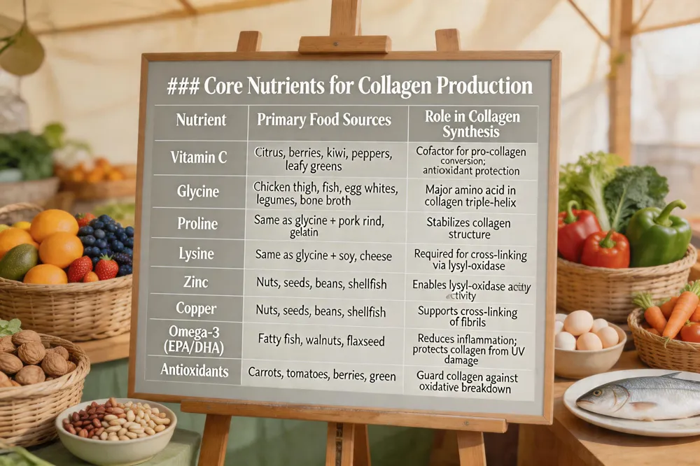 Collagen’s strength hinges on a handful of nutrients. Vitamin C, abundant in citrus, berries, kiwi, peppers and leafy greens, acts as a co‑factor that converts pro‑collagen into stable fibers while shielding them from oxidative stress. The three essential amino acids—glycine, proline and lysine—are supplied by high‑quality protein sources such as chicken thigh, fish, egg whites, legumes and bone broth. Zinc and copper, found in nuts, seeds, beans and shellfish, enable lysyl‑oxidase activity for cross‑linking collagen fibrils. Omega‑3 fatty acids from fatty fish, walnuts or flaxseed and antioxidants (beta‑carotene, lycopene, flavonoids) further protect collagen from UV‑induced breakdown. A balanced diet that pairs these nutrients with adequate hydration and low refined‑sugar intake creates the optimal environment for skin elasticity.