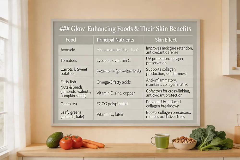 Avocado, tomatoes, carrots, and sweet potatoes are top glow‑enhancers. Avocado supplies monounsaturated fats and vitamin E; tomatoes deliver lycopene and vitamin C; carrots and sweet potatoes are rich in beta‑carotene, a provitamin A that supports collagen. Fatty fish such as salmon, sardines, and mackerel provide omega‑3 fatty acids that reduce inflammation and protect collagen fibers. Nuts and seeds (almonds, walnuts, pumpkin seeds) offer vitamin E, zinc, and copper, essential cofactors for collagen cross‑linking, while green tea polyphenols (EGCG) guard against UV‑induced collagen breakdown. Leafy greens—spinach, kale, collards—are vitamin C powerhouses and contain lutein, which may boost collagen precursors.