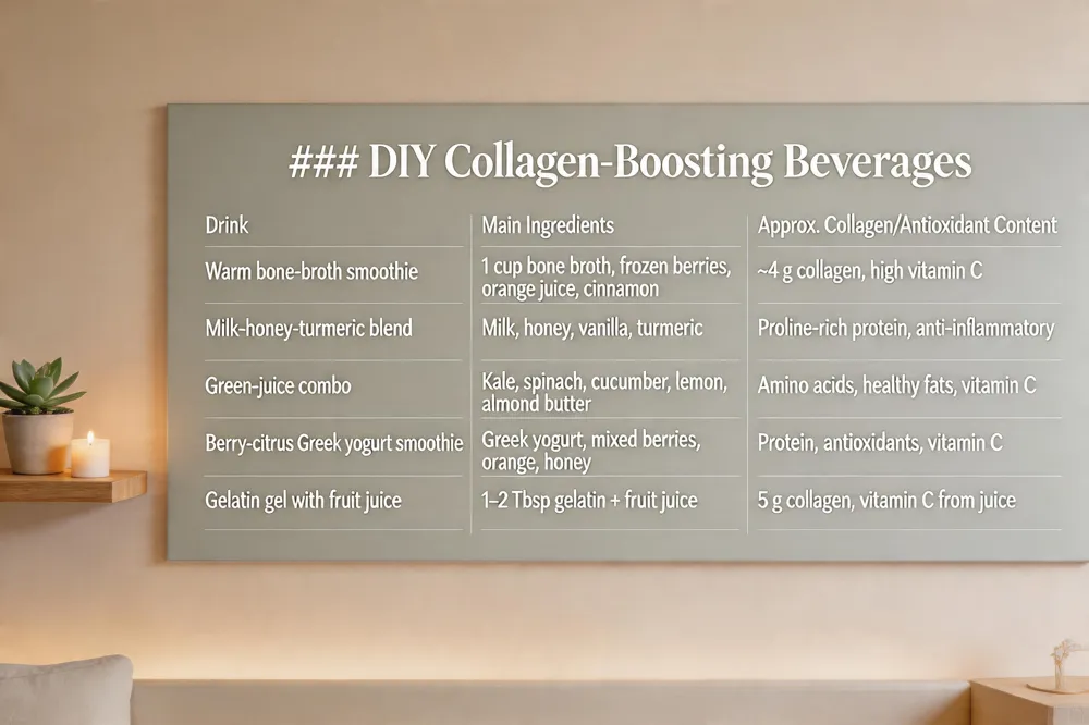 Simple collagen‑boosting beverages include warm bone broth smoothies (1 cup broth, frozen berries, orange juice, cinnamon) delivering ~4 g collagen plus vitamin C. A dairy version mixes milk, honey, vanilla, turmeric for proline‑rich protein. Green‑juice combos (kale, spinach, cucumber, lemon, almond butter) add amino acids and healthy fats. Berry‑citrus smoothies with Greek yogurt supply antioxidants and vitamin C.