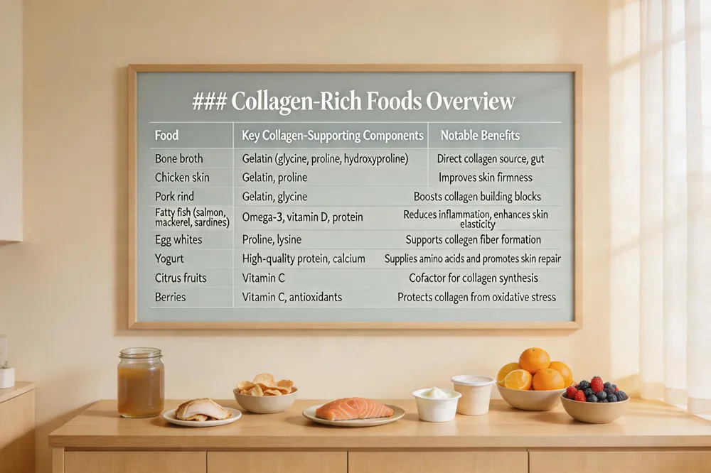 Eight collagen‑rich foods Bone broth, Chicken skin, pork skin, fatty fish, egg whites, yogurt, citrus fruits, berries.