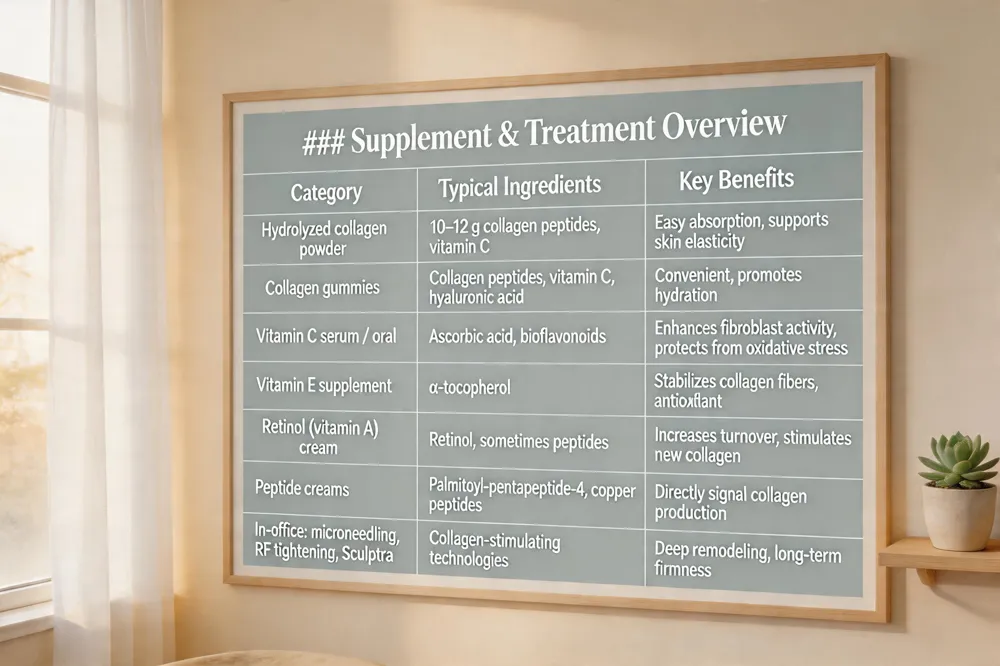 | Collagen gummies | Collagen peptides, vitamin C, hyaluronic acid | Convenient, promotes hydration |