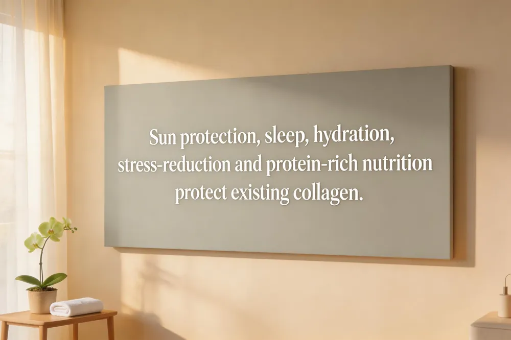 Sun protection is the cornerstone of collagen preservation; broad‑spectrum SPF 30+ applied daily blocks UV‑induced matrix metalloproteinases that degrade collagen and elastin. Smoking, excess alcohol and refined‑sugar foods accelerate oxidative stress and glycation, so quitting, limiting drinks and choosing low‑glycemic meals protect existing fibers. Adequate sleep, hydration (≥8 cups water) and stress‑reduction (mindfulness, yoga) support fibroblast activity and hormone balance, enhancing natural synthesis. During weight loss, maintain a protein‑rich diet (bone broth, eggs, fish), add collagen‑peptide supplements and omega‑3s, and combine strength training to fill loose skin. Women especially benefit from collagen’s role in skin, joint and bone health after menopause. To rebuild collagen and elastin naturally, consume vitamin‑C‑dense foods, avoid sugars, use retinoids or vitamin‑C serums, and practice regular gentle exfoliation. Hydrating serums with hyaluronic acid lock moisture, boosting elasticity daily.