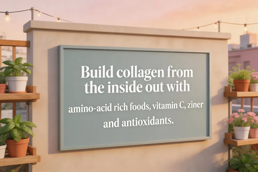 Collagen synthesis needs amino acids, vitamin C, zinc, copper and antioxidants. Animal foods (bone broth, skin‑on poultry, fatty fish, egg whites) give glycine, proline, hydroxyproline. Plant foods supply vitamin C (greens, peppers, citrus), zinc/copper (nuts, seeds) and sulfur (garlic).