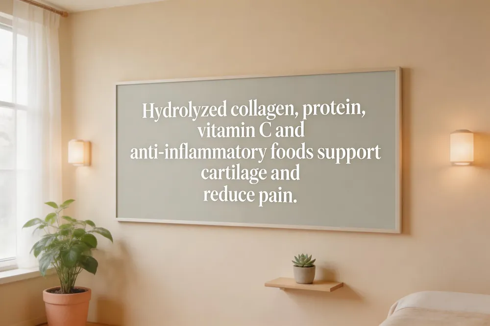 Collagen gives cartilage strength and elasticity, but production falls with age and wear. Eat protein foods (lean meat, fish, eggs, dairy) and vitamin C fruits/veggies; bone broth adds collagen fragments. Daily hydrolyzed collagen peptides (≈5–10 g) can lessen joint pain and support cartilage. Pair with swimming or cycling and maintain weight.