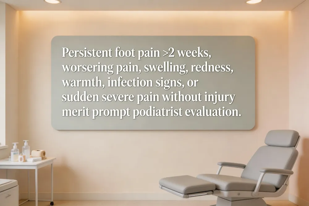 When to see a podiatrist about foot pain? Any pain lasting >2 weeks, pain that worsens, or pain with swelling, numbness, or difficulty bearing weight should trigger a visit.