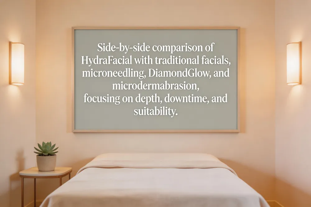 Hydrafacial vs microdermabrasion – Microdermabrasion sands the surface; HydraFacial combines mild acids with hydration, leaving skin and less irritation.
