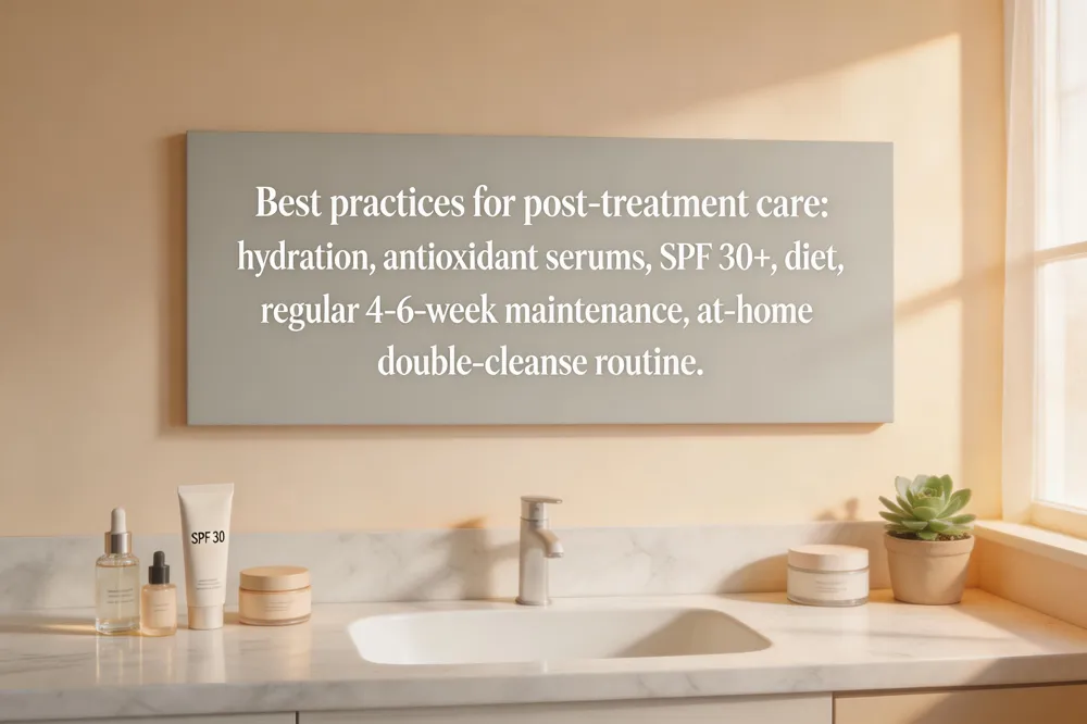 To get the most out of your HydraFacial, stay well‑hydrated before and after the treatment—water supports the deep moisturization the vortex‑fusion technology delivers. Follow the facial with a professional‑grade routine that includes antioxidant‑rich serums, hyaluronic acid, and peptides to keep the skin barrier strong and maintain the immediate glass‑like glow. Protect the newly rejuvenated skin daily with a broad‑spectrum SPF 30+ sunscreen, as UV exposure can quickly diminish results and accelerate aging. Eat a balanced diet rich in leafy greens, fruits, omega‑3 fish, and nuts to supply skin‑friendly vitamins from the inside out. Schedule regular HydraFacial maintenance every 4–6 weeks to build on each session’s benefits.