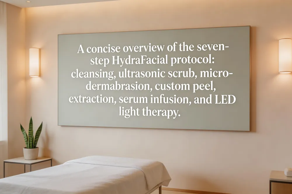 HydraFacial® relies on patented Vortex‑Fusion technology — a vortex‑suction wand that simultaneously cleanses, exfoliates and extracts, and infuses serums. The treatment follows seven distinct steps: (1) Cleansing – makeup and surface debris are removed. (2) Ultrasonic scrub / hydradermabrasion – a vibrating tip lifts dead skin cells. (3) Micro‑dermabrasion – gentle mechanical exfoliation opens pores. (4) Custom peel – a mild glycolic‑salicylic acid blend unclogs pores. (5) Extraction – painless vacuum suction clears blackheads and debris. (6) Serum infusion – antioxidant‑rich boosters (hyaluronic acid, peptides, vitamins) are delivered deep into the dermis. (7) LED light therapy & hydration – red or blue light seals the serums and adds a final antioxidant hydration layer. The result is immediate radiance, smoother texture, and reduced fine lines without no downtime. A typical session lasts 30‑45 minutes, and aftercare includes SPF and gentle moisturizers to protect the newly hydrated skin.