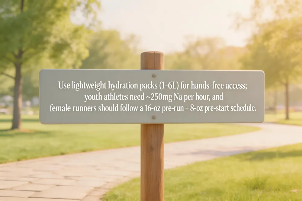 Runners typically use handheld bottles, waist‑pack bottles, or lightweight vests. For sessions longer than 45 minutes, an electrolyte‑replenishing sports drink is added to replace sodium, potassium and other minerals lost in sweat. A practical guideline is to sip 5‑10 oz of fluid every 15‑20 minutes. Pre‑hydrate 2‑3 hours before activity with 17‑20 oz of water, and after the run replace fluid loss with 16‑24 oz per pound lost.