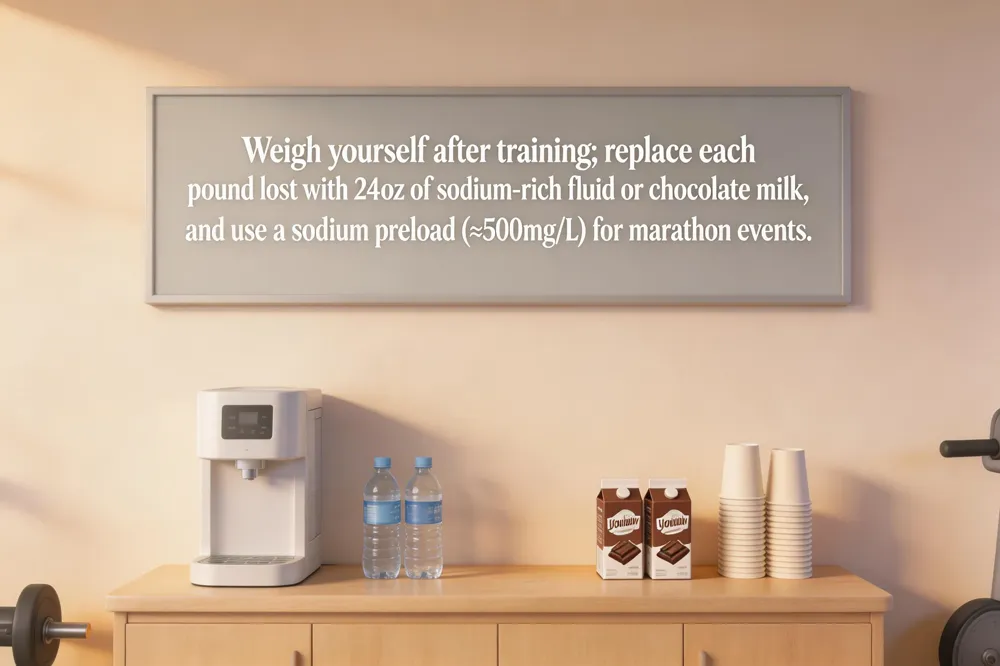 Athletes lose up to 2 quarts of fluid per hour, so re‑hydrating after a workout is critical for restoring plasma volume, preventing cramps, and supporting muscle recovery. Effective hydration strategies start with 17–20 oz of water 2–3 hours before activity and an extra 8 oz 20–30 minutes before the start. During exercise sip 4–8 oz every 15–20 minutes, using a sports drink that supplies ~200 mg sodium per 16‑oz serving when the session exceeds 45 minutes. After training, weigh yourself; replace each lost pound with 24 oz (≈3 cups) of fluid, preferably a sodium‑rich hypotonic drink or Chocolate milk for added protein and anti‑inflammatory benefits. Marathon hydration begins with a sodium‑rich preload the night before and 45 minutes before the race. Aim for 500–750 ml per hour of a drink containing at least 500 mg sodium per litre, sipping small amounts regularly; after the finish, replenish fluids and electrolytes with 20–24 oz per pound lost. Hydration calculators use body weight, sweat rate, temperature, and humidity to estimate fluid needs before, during, and after a race, giving personalized hourly targets. Charts and trackers record pre‑ and post‑exercise weight, calculate % fluid loss, note urine color (pale‑yellow = adequate), and remind “salty sweaters” to add sodium‑rich foods or drinks. Following this plan keeps body‑mass loss <2 % and optimizes recovery.