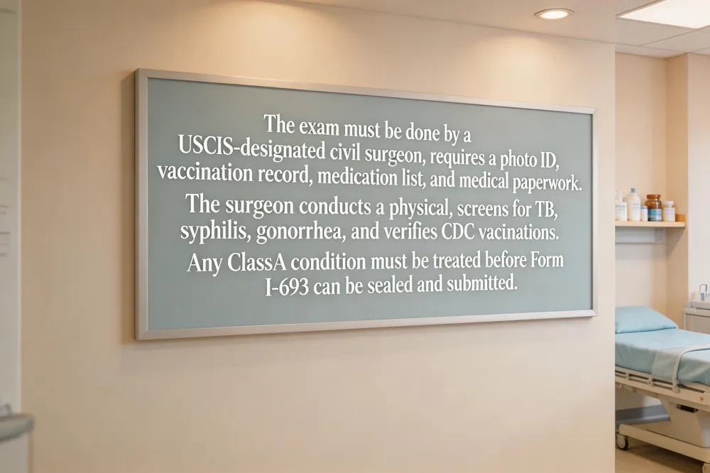 The exam must be performed by a USCIS‑designated civil surgeon (or an approved panel physician abroad). You will need a government‑issued photo ID, your vaccination record (or a signed translation), a list of current medications, and any relevant medical paperwork. The civil surgeon reviews your medical history, conducts a full physical exam, screens for communicable diseases (TB via IGRA blood test or chest X‑ray, syphilis, gonorrhea), and verifies vaccinations against the CDC schedule. Any Class A condition—active TB, untreated syphilis, leprosy, or other quarantinable illnesses—must be treated before Form I-693 can be completed. After the exam, the surgeon signs and seals Form I-693, which you submit together with your I-485 or visa package.
