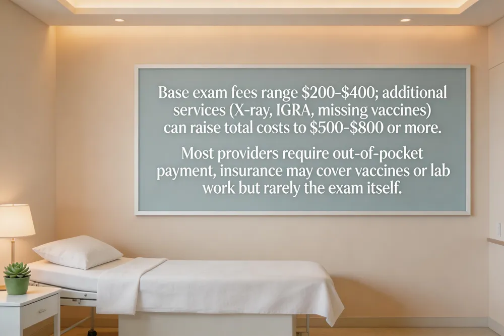 When you schedule a USCIS‑approved immigration medical exam, the base physician fee for the exam and the completion of Form I‑693 typically falls between $200 and $400. This amount covers the history review, physical exam, and the doctor’s certification on the form. Additional costs can arise if the civil surgeon needs to order a chest X‑ray, an IGRA blood test for tuberculosis, syphilis or gonorrhea screening, or if you are missing any of the required vaccinations (MMR, Tdap, varicella, Hepatitis B, influenza, etc.). Those extra services can push the total bill into the $500‑$800 range or higher, especially if multiple vaccines must be administered on site.