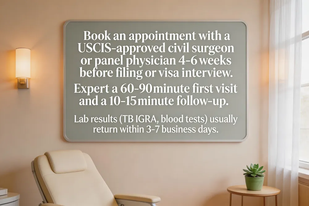 A: Select a USCIS‑approved panel physician from the list provided by the U.S. consulate or embassy handling your case. Most clinics, including Jana HealthCare, allow online booking or phone scheduling. Quote your visa case number and confirm you will bring your interview confirmation letter, a valid passport, four recent photographs, and any vaccination or medical records. Schedule the exam at least 4‑6 weeks before your visa interview or I‑485 filing to accommodate lab processing (TB IGRA 2‑5 business days, syphilis 1‑3 business days) and any needed vaccinations. The first visit usually lasts 60‑90 minutes; a second visit for results and seal‑up may be 10‑15 minutes.