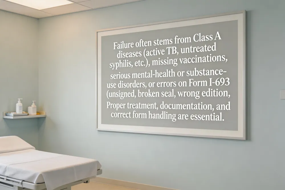 Failure can result from a diagnosis of a public‑health communicable disease (Class A), such as active tuberculosis, infectious syphilis, gonorrhea, leprosy, measles, polio, or rubella. The examiner also checks for mental or physical disorders that pose a threat to safety, and serious conditions can render an applicant inadmissible. Missing or incomplete required vaccinations, untreated diseases, or any condition that would trigger quarantine under a presidential executive order can also cause a refusal. Finally, an outdated, unsigned, or improperly sealed Form I‑693—especially missing treatment documentation for a previously identified disease—will be rejected by USCIS.