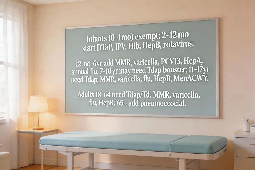 U.S. immigration law ties vaccination requirements to the applicant’s age, mirroring the CDC’s Advisory Committee on Immunization Practices (ACIP) schedule. Infants and newborns (0–1 month) are exempt – no immigration‑required vaccines are needed. Children 2–12 months must start the pediatric series: DTaP, inactivated poliovirus (IPV), Haemophilus influenzae type B (Hib), Hepatitis B, and rotavirus (administered between six and eight weeks). From 12 months through six years, the list expands to include MMR (measles‑mumps‑rubella), varicella, a second DTaP/IPV series if not completed, pneumococcal conjugate (PCV13), Hepatitis A (starting at 12 months), and the annual flu vaccine once the child is six months old. Adolescents 7‑10 years may need a Tdap booster depending on prior vaccinations, while 11‑17 year‑olds require Tdap (or Td), MMR, varicella, seasonal influenza, Hepatitis B, and, when indicated, the MenACWY meningococcal vaccine. Adults 18‑64 years must be up‑to‑date on Tdap/Td, MMR, varicella, seasonal influenza, and Hepatitis B; seniors 65 years and older also need pneumococcal vaccination (PCV13/PCV23). Special exemptions apply: newborns under one month need no vaccines; seniors may receive a pneumococcal polysaccharide (PPSV23) if they have specific risk factors, and the influenza vaccine requirement is waived outside the flu season (Oct 1‑Mar 31) or for medically contraindicated individuals.
