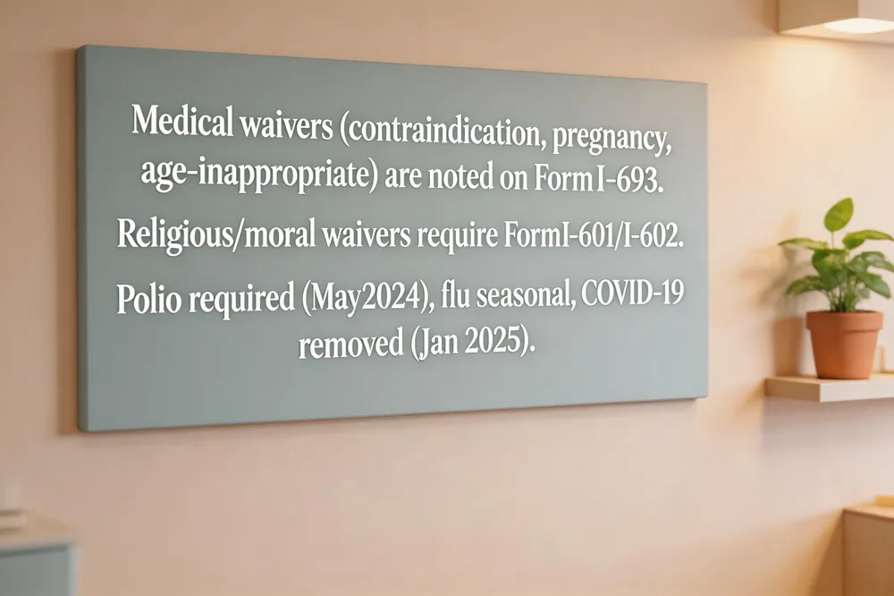 - Can a vaccine be waived during the I‑485 medical exam? Yes. The civil surgeon can waive a required vaccine for medical reasons and records it on Form I‑693; USCIS then waives that specific requirement.