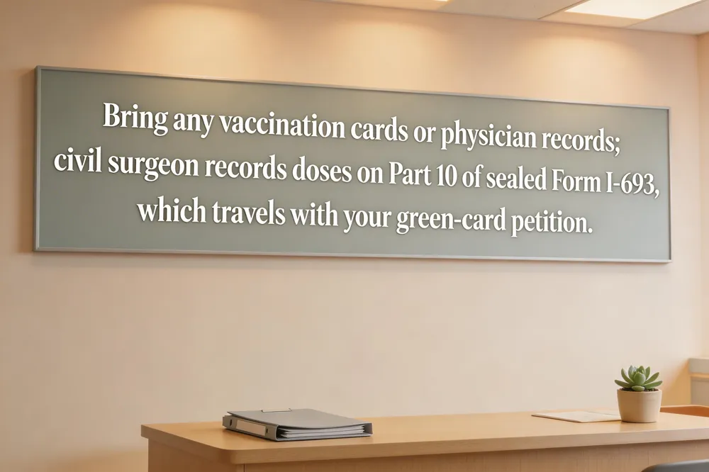 Appointment tips: Call ahead to verify that the office accepts your payment method (USCIS does not regulate vaccine fees[https://www.uscis.gov/tools/designated-civil-surgeons/vaccination-requirements]) and to confirm they have the seasonal flu vaccine if your exam falls between October 1 and March 31. Ask if they provide vaccine information statements (VIS) in your preferred language—this aligns with holistic, patient‑centered care. Arrive early, bring a valid photo ID, and your completed Form I‑693 (or a blank copy for the surgeon to fill out). If you lack vaccination records, bring any scrap of paperwork you have; the civil surgeon can order serologic titers to prove immunity and will administer any missing doses on the spot. Once the exam and vaccinations are complete, the surgeon seals Form I‑693 and returns it to you for submission to USCIS.
