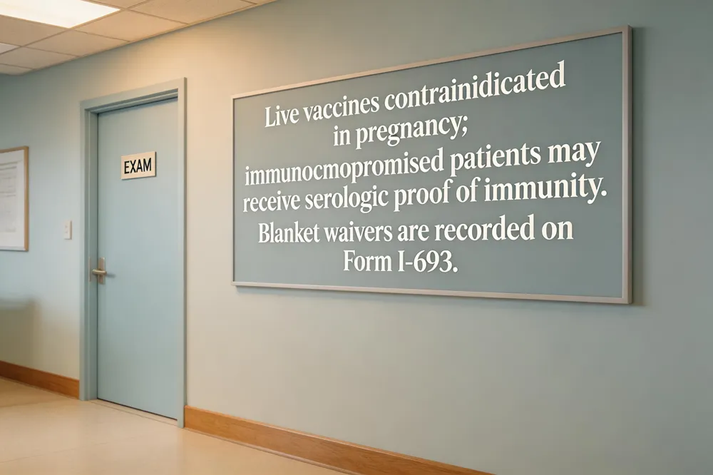 Pregnancy is a recognized medical condition that can make live vaccines (e.g., MMR, varicella) contraindicated. The civil surgeon will note the pregnancy on Form I‑693 and mark the affected vaccines as “contraindicated.” This blanket waiver protects the applicant from inadmissibility while allowing the exam to proceed. Once the pregnancy ends, the applicant can receive the missed doses and submit a revised I‑693 if desired. Non‑live vaccines such as tetanus‑diphtheria‑pertussis (Tdap) and inactivated influenza are generally permissible during pregnancy and are administered when indicated.