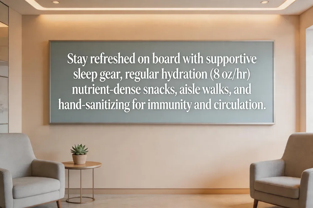 Flight attendants know that a smooth journey starts long before you step onto the tarmac. Sleep strategies on board – bring a supportive neck pillow, eye mask, and earplugs; consider a low‑dose melatonin or a brief guided meditation to drift off and keep the cabin lights dimmed. Smart snacking and hydration – sip 8 oz of water each hour (or a electrolyte‑rich beverage) and avoid alcohol and caffeine, which worsen dehydration and jet‑lag. Pack nutrient‑dense snacks such as mixed nuts, fresh fruit, or veggie sticks to sustain blood‑sugar levels and support immunity with vitamin C and zinc. Movement and circulation – stand or walk the aisle every hour, and perform simple calf‑raises, shoulder rolls, and neck stretches to keep blood flowing and lower the risk of deep‑vein thrombosis. Hand hygiene and cabin cleanliness – use antibacterial wipes on tray tables, armrests, and seat backs; wash hands frequently and keep a travel‑size hand sanitizer handy. Alcohol and caffeine moderation – limit alcoholic drinks to one per flight and replace coffee with herbal tea to reduce diuresis and improve sleep quality. Post‑arrival schedule alignment – reset your sleep‑wake cycle to the destination’s time zone as soon as possible, expose yourself to natural light in the morning, and keep meals regular to help the circadian rhythm adjust. Together, these habits keep you refreshed, hydrated, and ready to enjoy your trip.