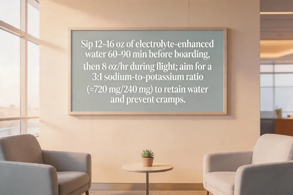Practical schedule: 60–90 minutes before boarding, drink 12–16 oz of water mixed with a light electrolyte solution (or a pinch of sea‑salt powder). During the flight, sip 8‑oz glasses every hour, choosing electrolyte‑enhanced beverages over plain water to avoid diluting blood sodium. After landing, continue moderate fluid intake and consider a post‑flight IV session (30‑60 min) to replenish lost electrolytes and deliver vitamins such as B‑12, vitamin C, and magnesium for rapid recovery.