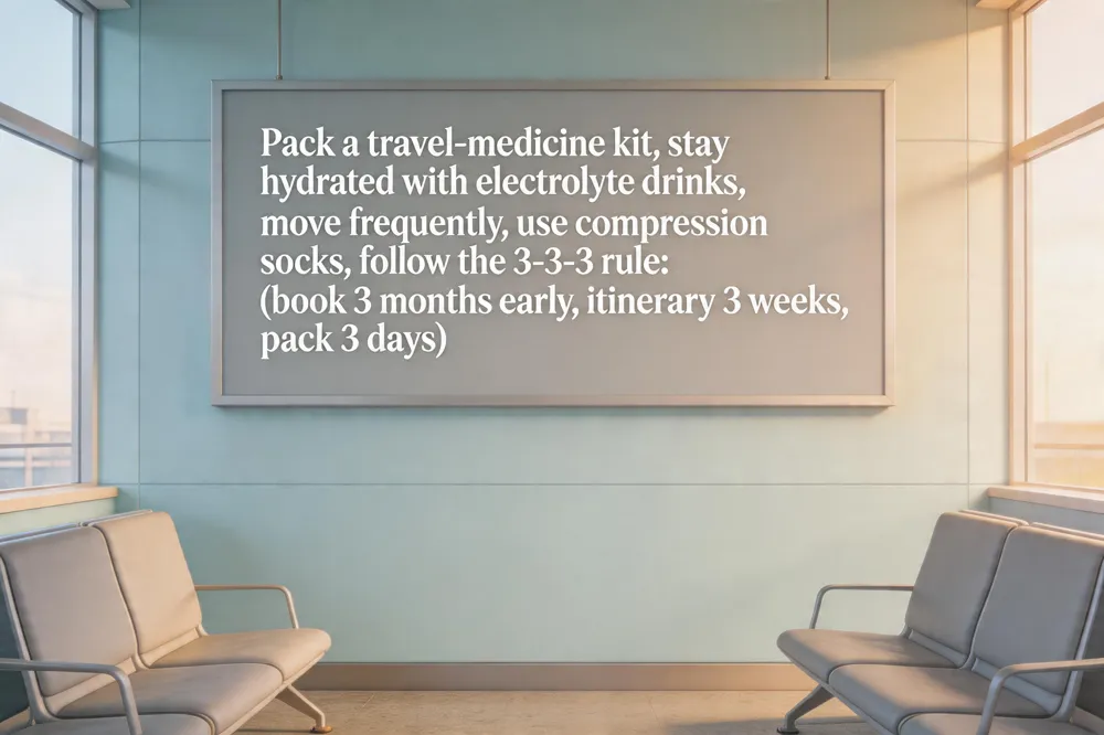 Traveling across continents can be exhilarating, but the dry cabin air (10‑20 % humidity) quickly saps fluids, amplifying fatigue and jet‑lag. Start by prioritizing hydration: sip a refillable bottle of water‑plus‑electrolytes before boarding, continue steady sips during the flight, and re‑hydrate with a balanced electrolyte drink after landing. Pack a compact travel‑medicine kit that includes pain relievers, motion‑sickness tablets, allergy meds, electrolyte packets, and a sanitizer with ≥ 60 % alcohol for frequent hand‑washing. Keep circulation moving—walk the aisles, stretch in the bathroom, use compression socks, and schedule short walks or light jogs each day. For skin and immune protection, apply a lightweight, antioxidant‑rich moisturizer, consider a quick spa treatment such as a massage or sauna, and supplement with IV blends that contain magnesium, vitamin C, zinc, and B‑complex vitamins for rapid re‑hydration and immune support. Follow the 3‑3‑3 rule: book flights 3 months early, finalize itineraries 3 weeks before departure, and pack 3 days ahead. This organized approach reduces stress, saves money, and ensures you arrive refreshed and ready to enjoy your destination.