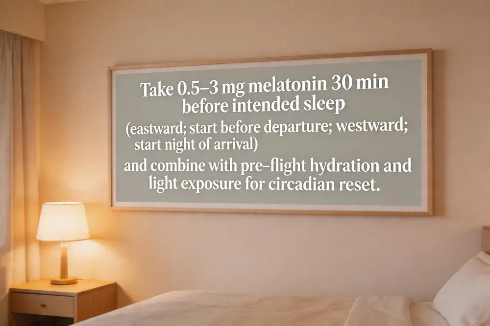 Melatonin, the body’s natural sleep hormone, is the most widely recommended medication for resetting the circadian clock after crossing time zones. A low dose (0.5–3 mg) taken after dark on the first night of travel—ideally 30 minutes before the intended sleep time—helps signal the brain that it is nighttime. For eastward travel, where the internal clock must be advanced, start melatonin a few evenings before departure; for westward trips, begin on the night of arrival. The supplement should be continued for 2–3 nights until a regular sleep pattern re‑establishes.
