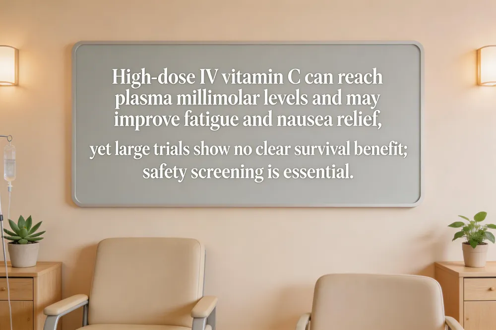 IV vitamin therapy is sometimes explored in cancer care, especially high‑dose vitamin C. Because the infusion bypasses the gut, plasma vitamin C levels can reach millimolar concentrations that oral dosing cannot achieve, and small studies have reported modest reductions in fatigue, chemotherapy‑related nausea, and overall quality‑of‑life scores. However, large‑scale randomized trials have not demonstrated tumor shrinkage, longer survival, or consistent symptom relief, so the clinical benefit remains uncertain. Safety is a key concern for oncology patients: IV infusions can cause infection, phlebitis, fluid overload, and, in rare cases, kidney injury or hemolysis in individuals with G6PD deficiency or kidney disease. Vitamin preparations are not FDA‑approved for cancer treatment. Patients should discuss any IV regimen with their oncologist, ensure sterile administration by qualified staff, and prioritize evidence‑based therapies and lifestyle measures such as balanced nutrition, adequate hydration, and regular physical activity.